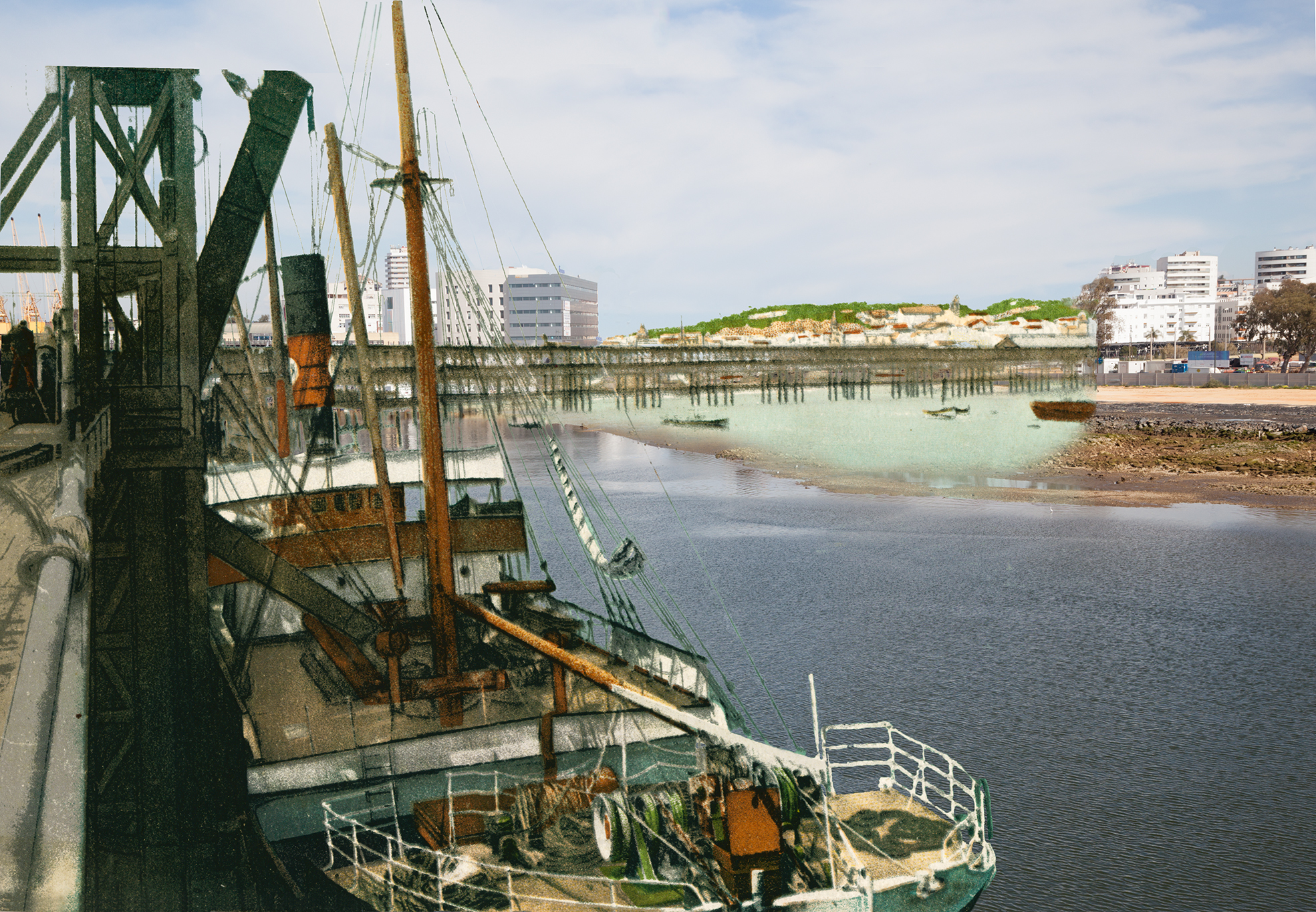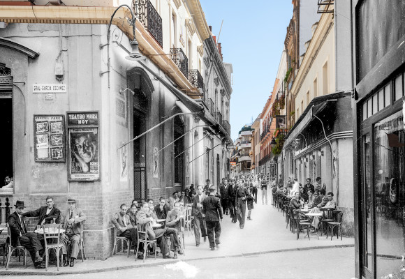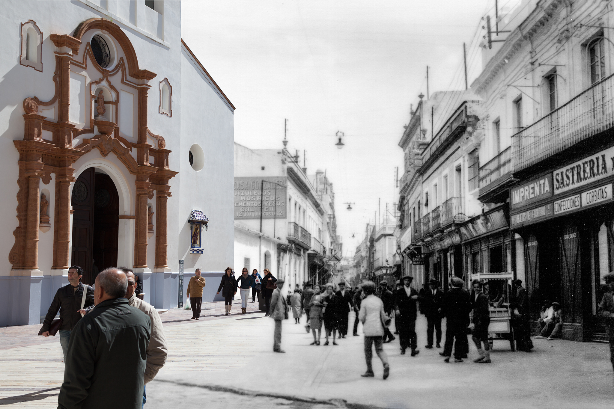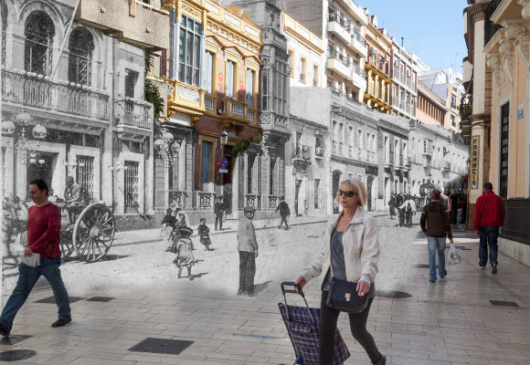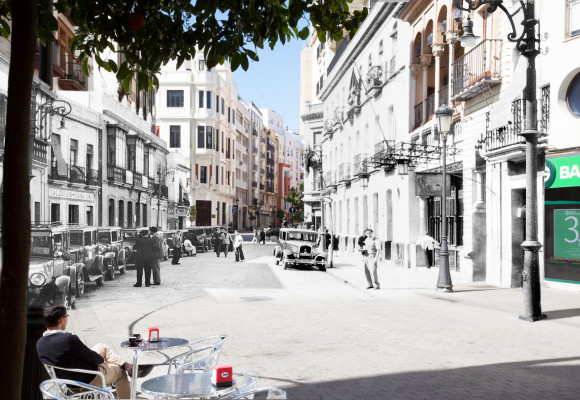 A veces he usado fotografías de épocas anteriores a los años que yo mismo viví en esas ciudades, pues al mirarlas pronto caí en la cuenta de otros muchos mundos perdidos además del mío, los de aquellos malagueños y onubenses que las habitaron antes que yo. Quisiera que las imágenes resultantes de esa fusión sean capaces de mostrar no sólo el mundo que se fue, sino también el que se está yendo ante nuestros ojos. A veces la transformación que expresan las imágenes puede estar en lo arquitectónico o lo urbano; a veces, más sutil y profundamente, en las personas; casi siempre, en ambos.